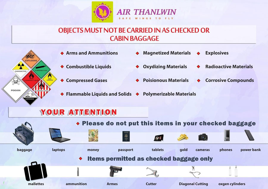 PASSENGERS ARE REQUESTED TO REPORT AT THE AIRTHANLWIN CHECK-IN COUNTER AT LEAST TWO HOURS PRIOR TO SCHEDULED DEPARTURE. THE CHECK-IN COUNTER WILL BE CLOSED 30 MINUTES PRIOR TO DEPARTURE. BOARDING WILL COMMENCE SHORTLY AFTER CHECK-IN HAS CLOSED. AIRLINE WILL NOT BE RESPONSIBLE FOR LATE REPORTING OF PASSENGERS.